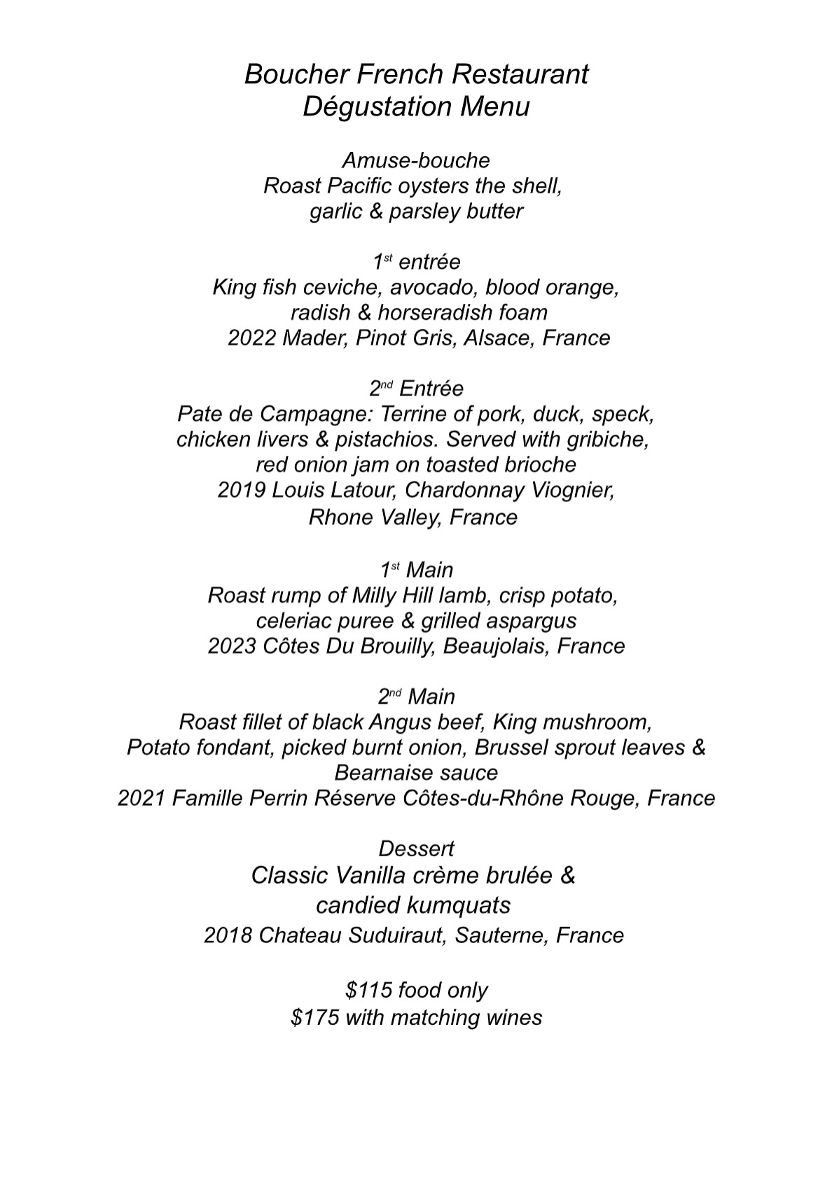 Boucher 2025 Degustation Menu