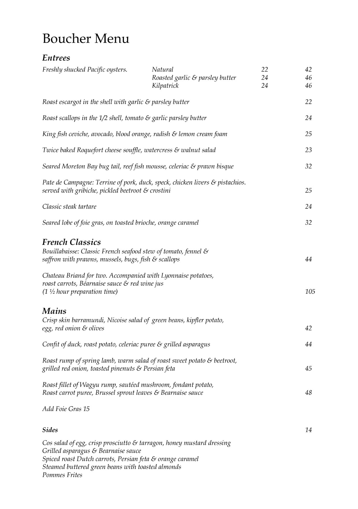 Please note our Chateau Briand takes around 1h 30min to cook. This is a much-loved French classic for two to share, we recommend pre-ordering this dish when making your reservation.